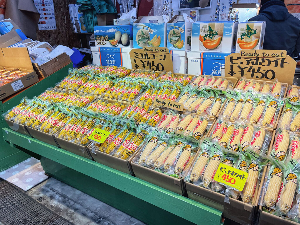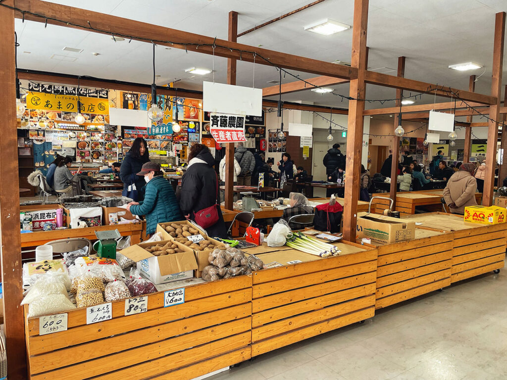 函館朝市廣場有許多販賣新鮮蔬果、各式農產品與海鮮的攤販,有些也有代客料理的服務,你可以挑選喜歡的新鮮海產並有座位區可以用 。