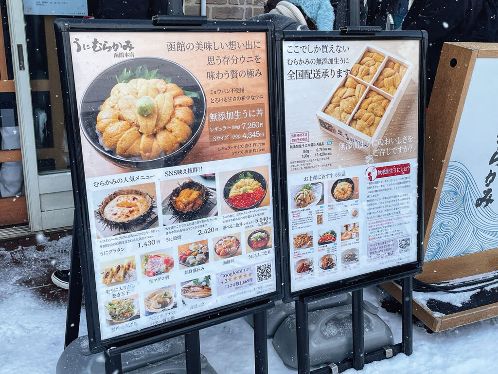雖然我朋友說絕對值得排隊,我太晚出門到的時候店門外已經排很多人,加上正在下大雪,我只好先忍痛放棄,下次來函館再特地安排來用餐,有興趣的人也可以先在村上海膽官網參考看看。