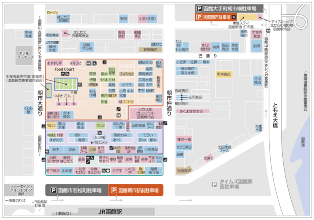 函館朝市可逛的範圍非常大,主要包含三棟室內市場:函館朝市廣場、橫丁市場、駅二市場,以及各市場室外周邊的店舖,最知名的行程就是吃帝王蟹、海膽飯、哈蜜瓜以及釣活烏賊體驗。