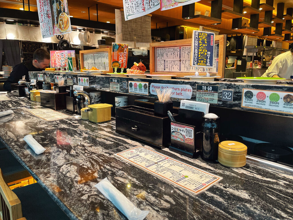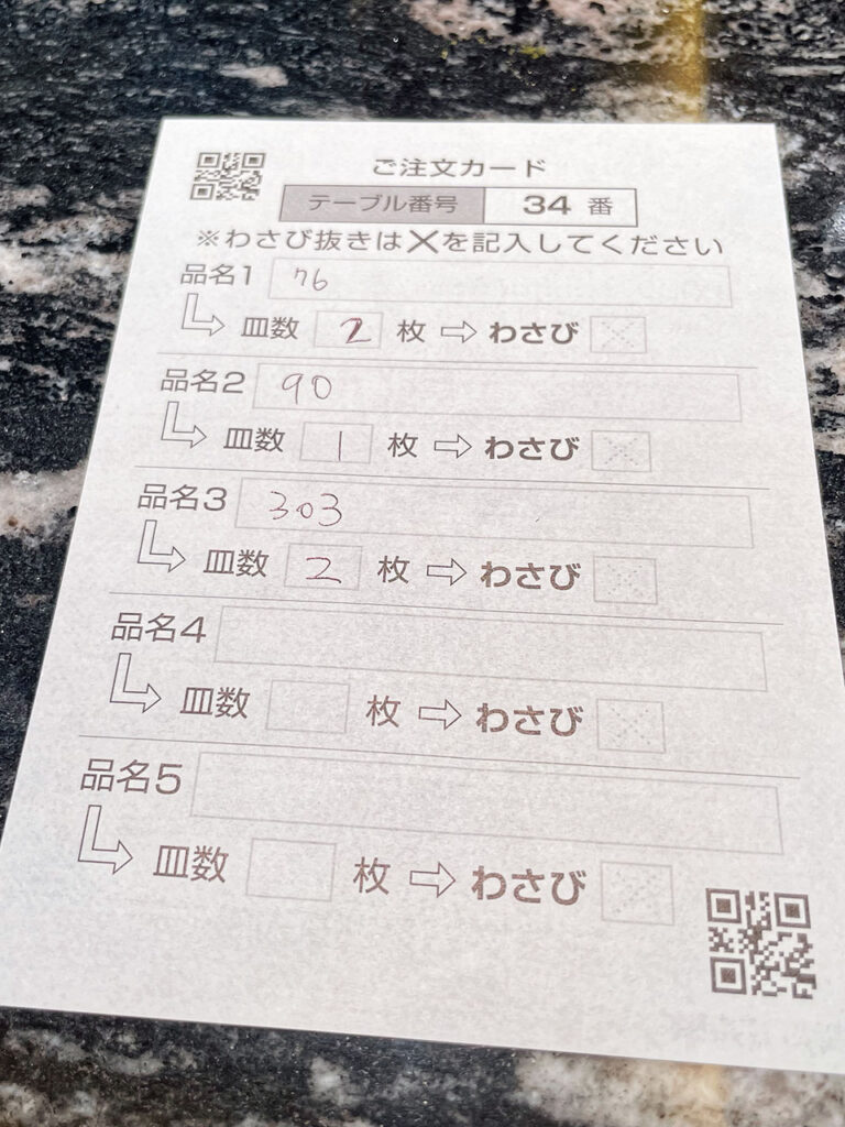 雖然根室花丸是迴轉壽司,但是大多數還是依賴寫單點餐,轉檯上的壽司品項並不多。各項壽司價位大多落在165-528日幣不等,特別的食材可能會比較貴一些,有時候師傅會出一些特別餐,如果你有興趣的話就要趕快舉手說你也要。