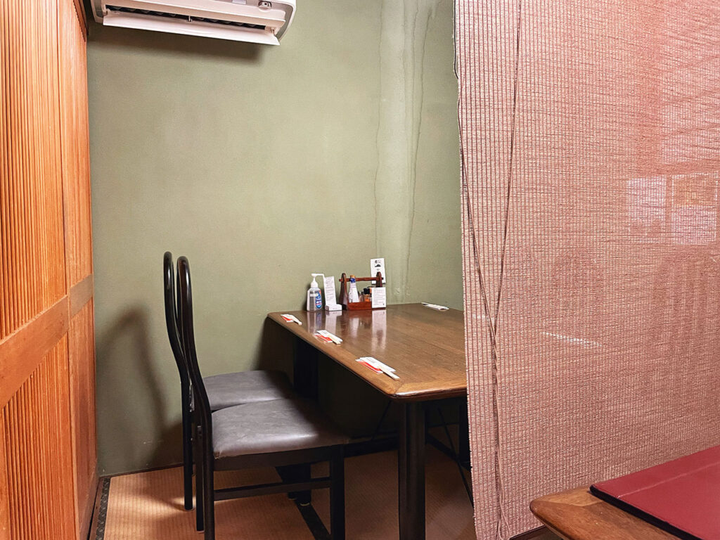 內部裝潢是日式榻榻米地板,需要拖鞋但有椅子可以坐。