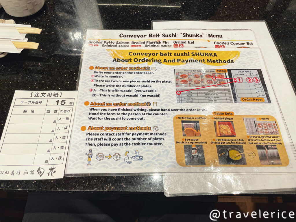 點餐是用寫單再拿給店員,都可以選擇壽司要不要加山葵。