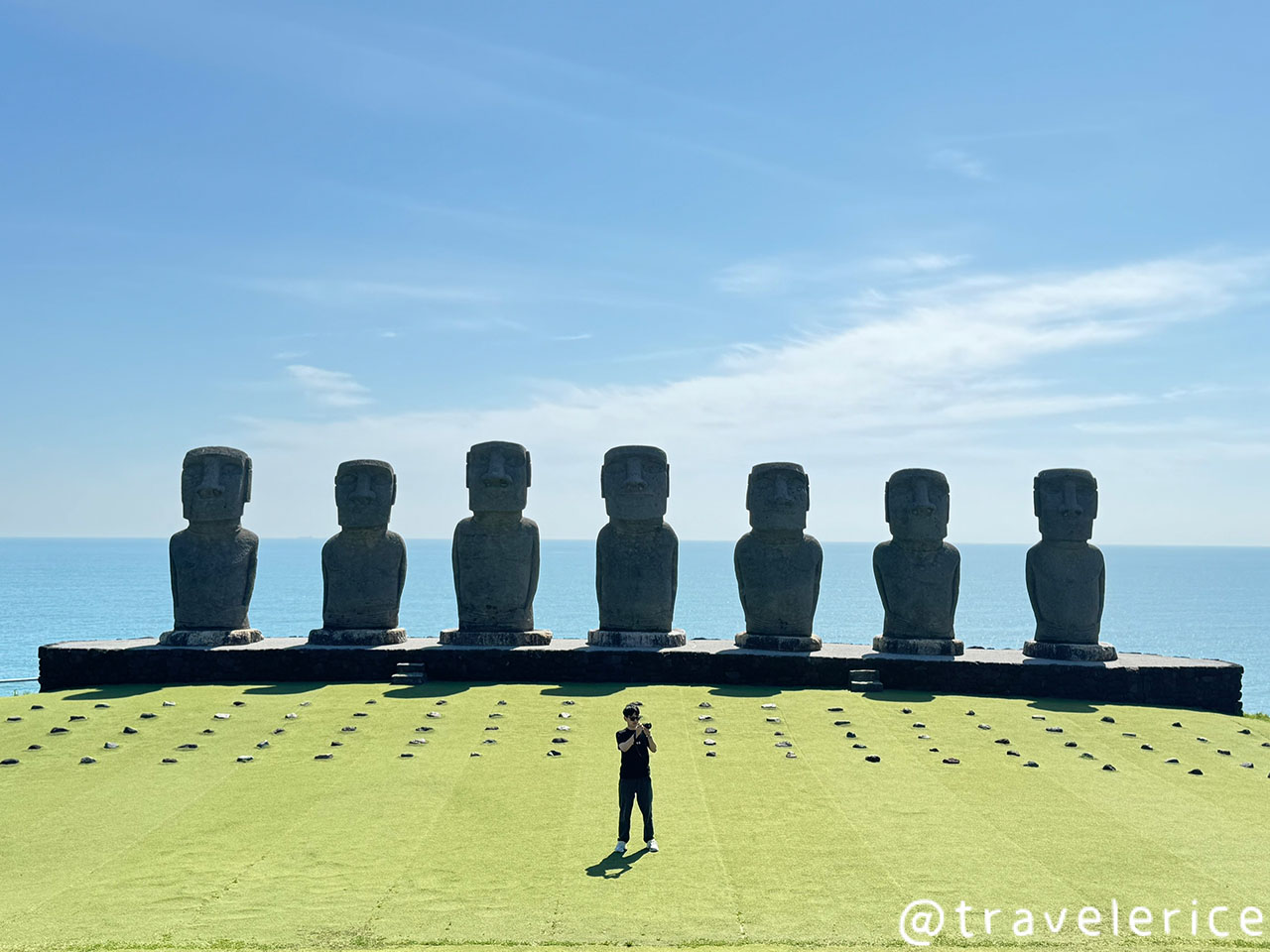 入園後不久就可以看到摩艾廣場,最知名的摩艾石像就佇立在岸邊,摩艾石像傳說為復活島的守護神,雖然暫時沒機會到復活島參觀摩艾石像真跡,但能就近目睹被官方授權復刻的摩艾石像也非常的開心。