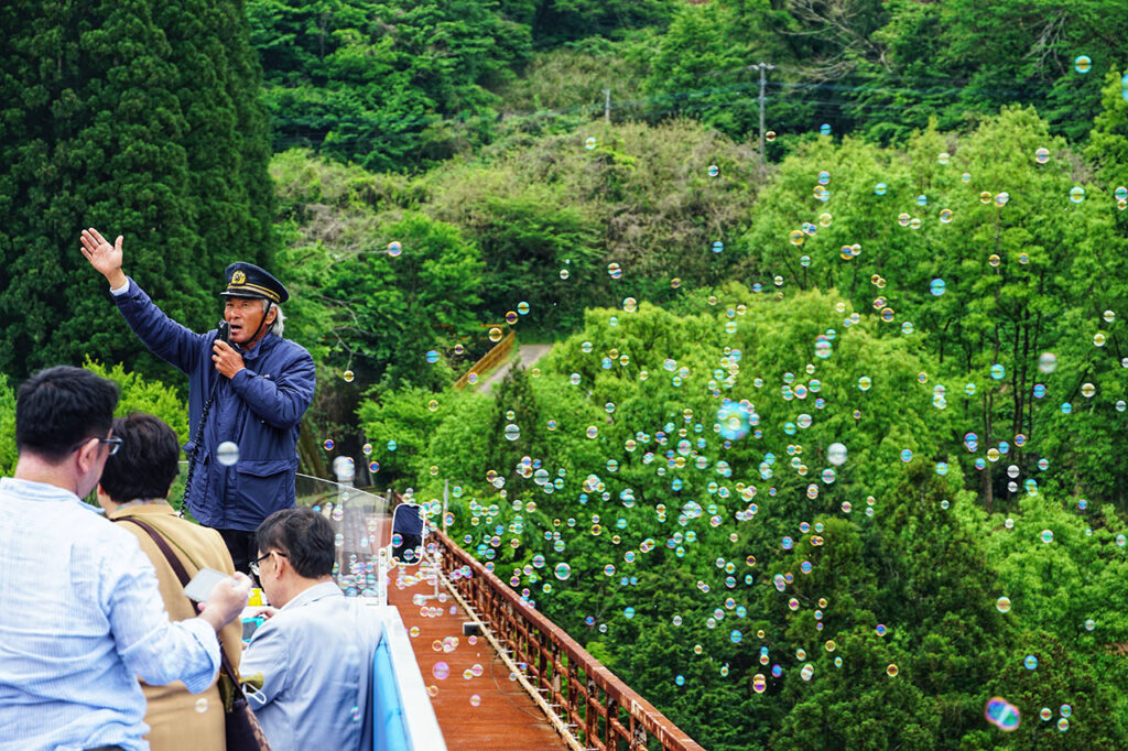 早上我們開車從日向出發,第一個行程是到高千穗車站搭乘小火車,因為只能現場購票不能預約,我們選擇安排在第一個行程以彈性調整後面行程,很幸運地10點抵達還可以購買10:20的班次。小火車會從高千穗車站出發,鐵路往返大約5公里、耗時30分鐘,沿路將經過多個景點,並停在日本最高的鐵道橋上( 105公尺高 )讓遊客欣賞風景,詳細體驗可以參考我的文章: