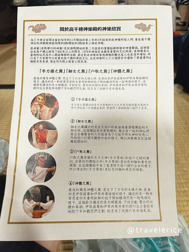 透過欣賞舞蹈表演以及樂器的伴奏更加了解高千穗地區的神話故事,算是非常特別的體驗。