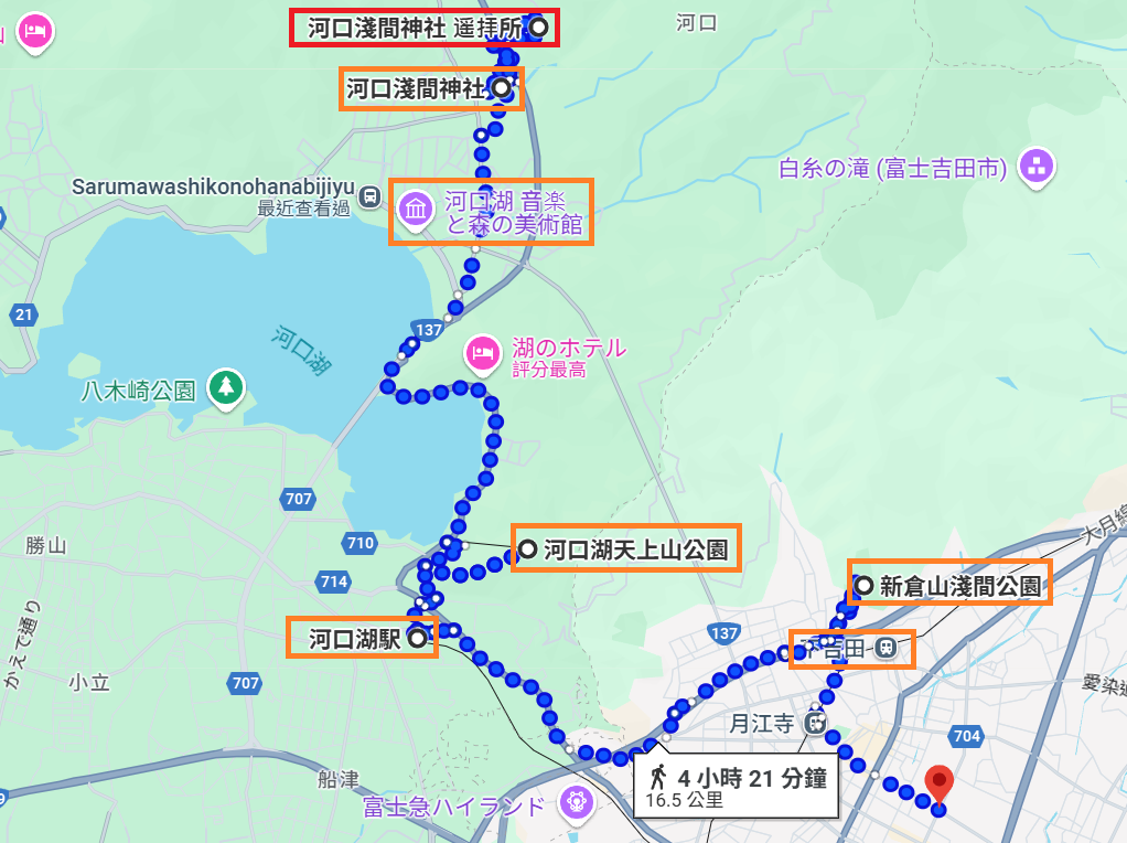 早上在河口湖車站寄放完行李,就在車站外搭計程車前往天空鳥居遙拜所,給司機看照片跟地址就出發,司機可能覺得我們想從淺間神社開始參觀,就放我們在門口下車,費用是2,400日圓。但我們很後悔沒有請司機載我們上山,多走了40分鐘的山路才會到天空鳥居,可以參考淺間神社官網地圖。